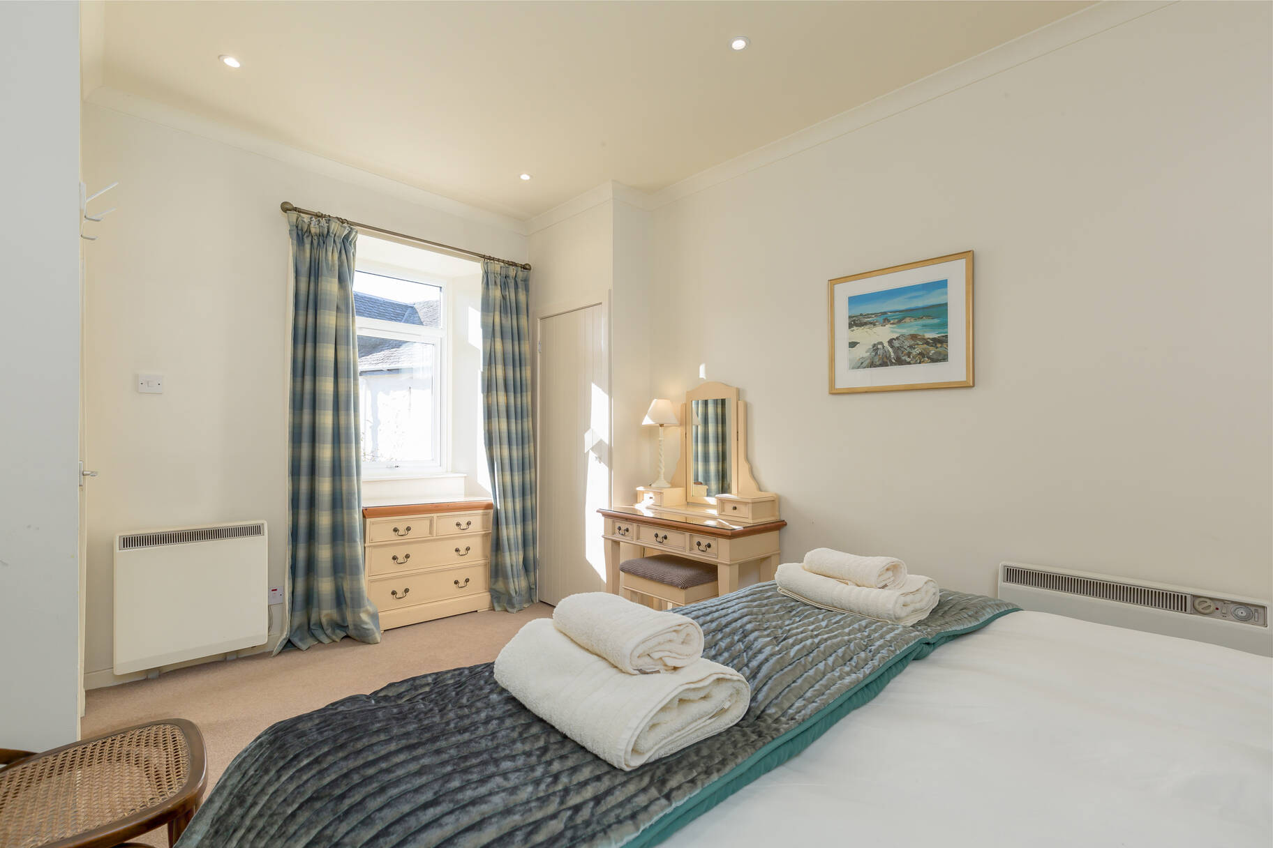 Inside, the open-plan living area invites relaxation, featuring a welcoming sitting room with a traditional open fire, a dining space, and a well-equipped kitchen complete with a coffee machine. Two single sofa beds in the sitting room offer flexibility for occasional guests. The spacious double bedroom, located upstairs, enjoys peaceful views of the cottage’s private garden. A modern bathroom with a bath, over-bath electric shower, WC, basin, and under-floor heating completes the amenities.
