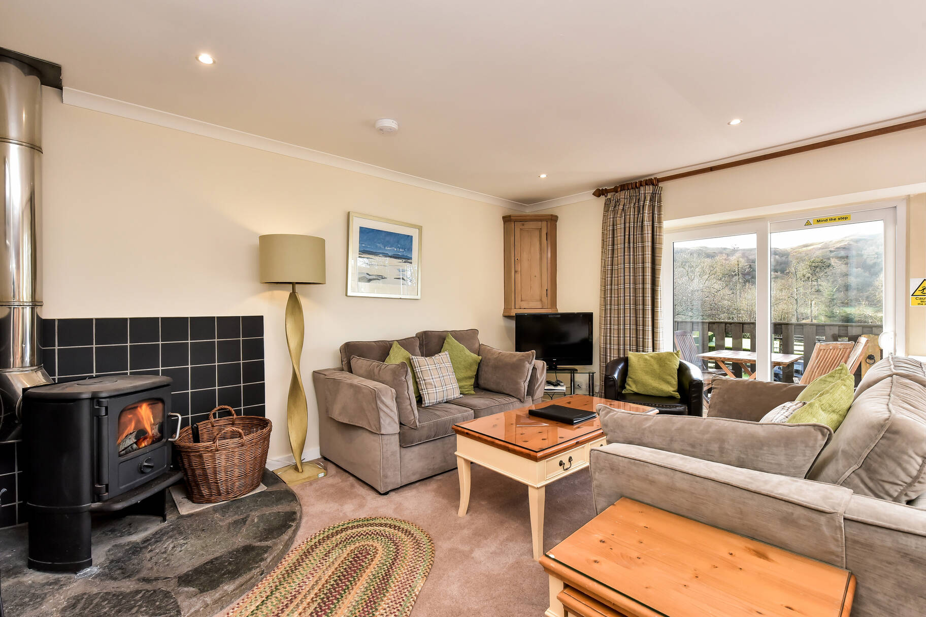 Inside, the spacious open-plan living area combines a sitting room with a wood-burning stove, a dining area, and a fully equipped kitchen. Large sliding patio doors open onto the balcony, creating a bright, airy space where you can enjoy the stunning views.