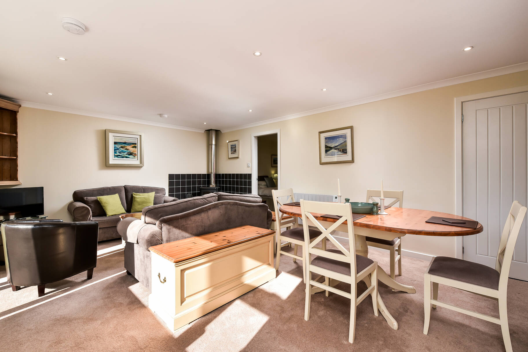 Coachmans West is an elevated first-floor apartment with stunning views over Melfort Village, offering spacious open-plan living, a private balcony, and two comfortable bedrooms. Perfect for a tranquil escape.