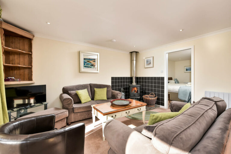 Inside, the spacious open-plan living area combines a sitting room with a wood-burning stove, a dining area, and a fully equipped kitchen. Large sliding patio doors open onto the balcony, creating a bright, airy space where you can enjoy the stunning views.