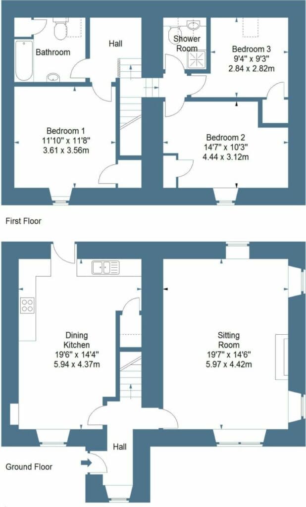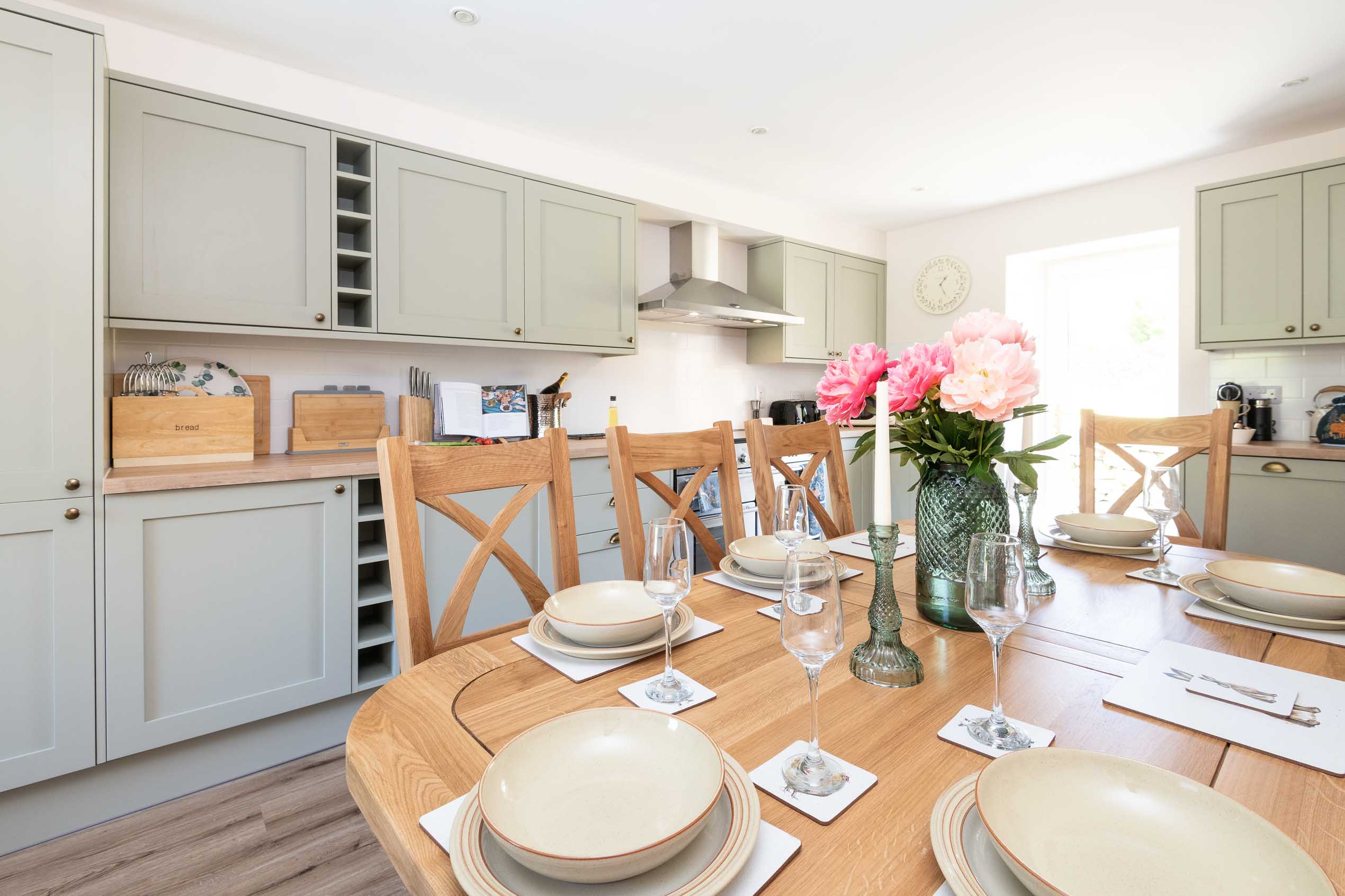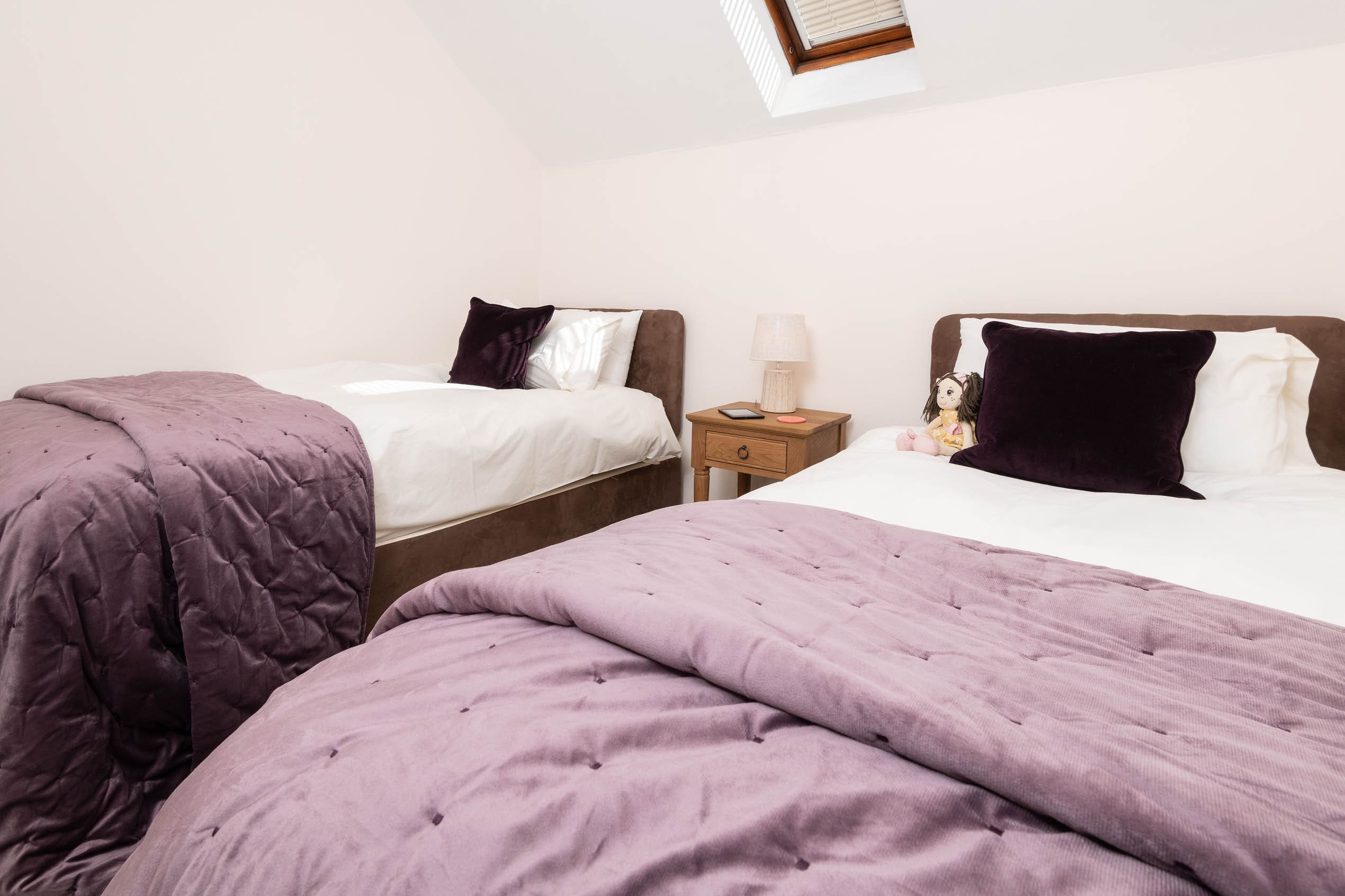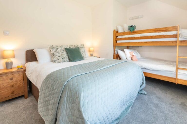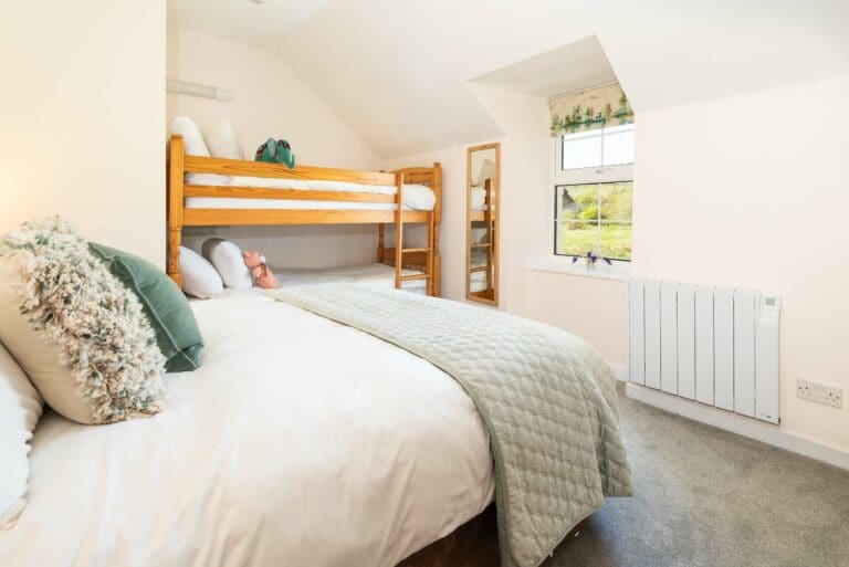 Upstairs you’ll find three comfortable bedrooms – a peaceful double, a twin, and a family room with both a double and a bunk bed, giving flexible sleeping arrangements for up to ten guests. A main bathroom with a bath and over-bath shower, WC and basin, plus an additional shower room with a shower cubicle, WC and basin, ensure convenience for everyone.
