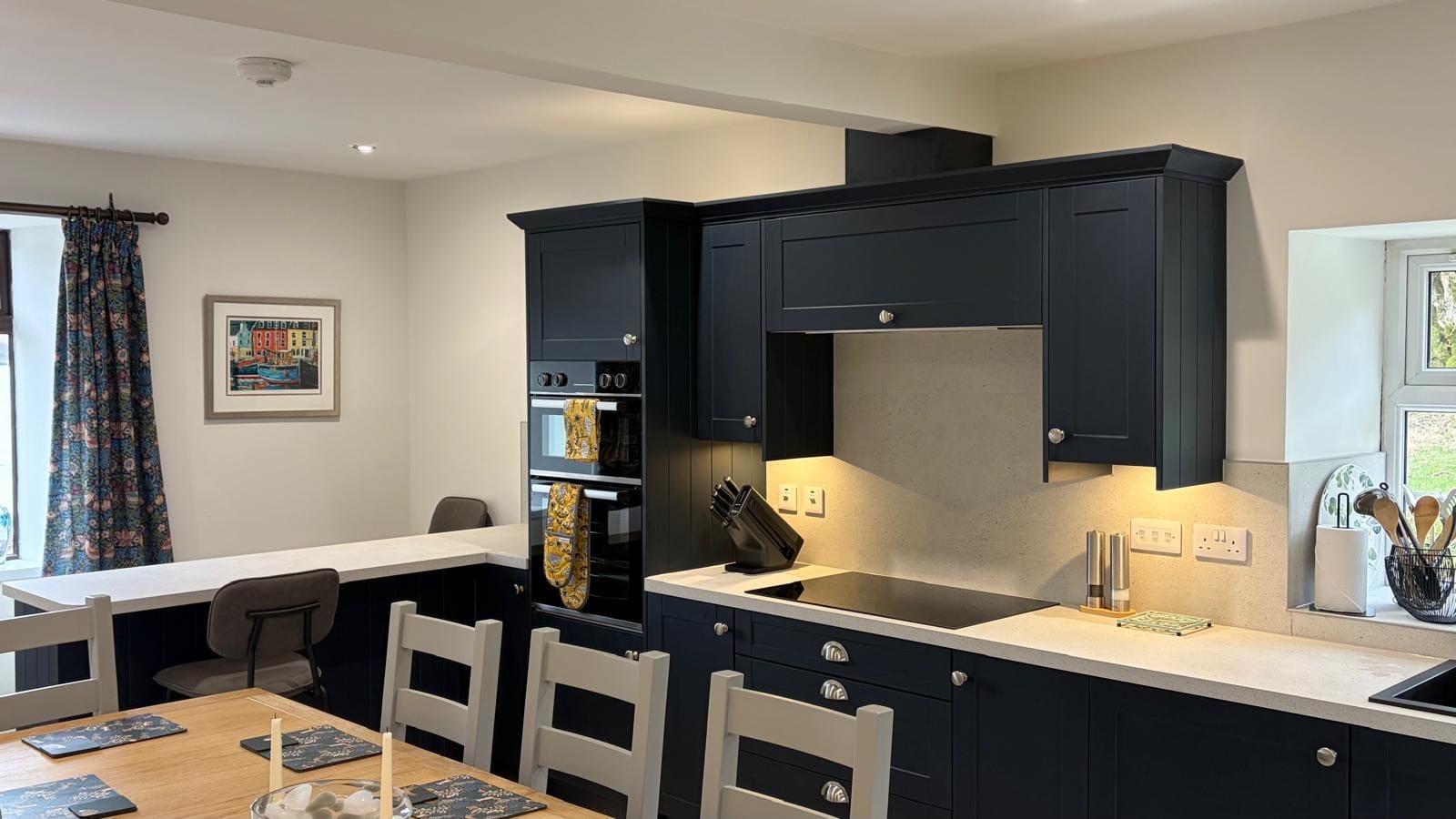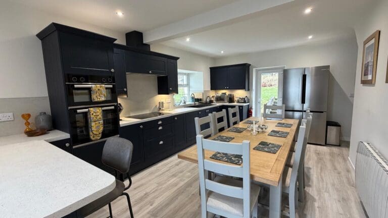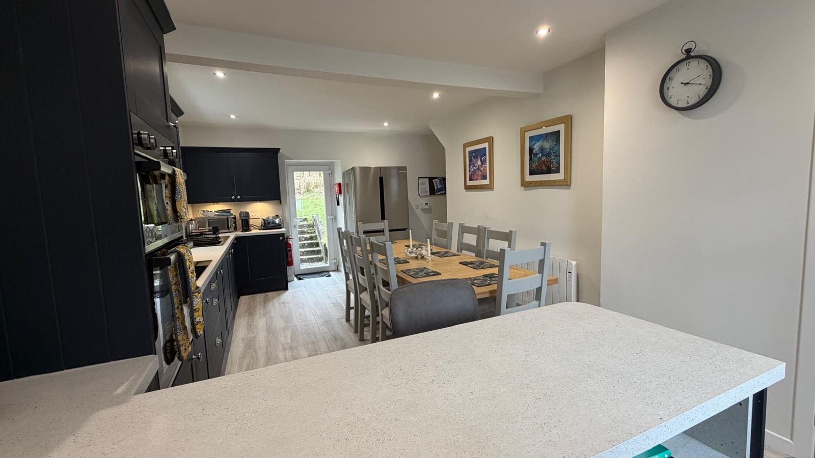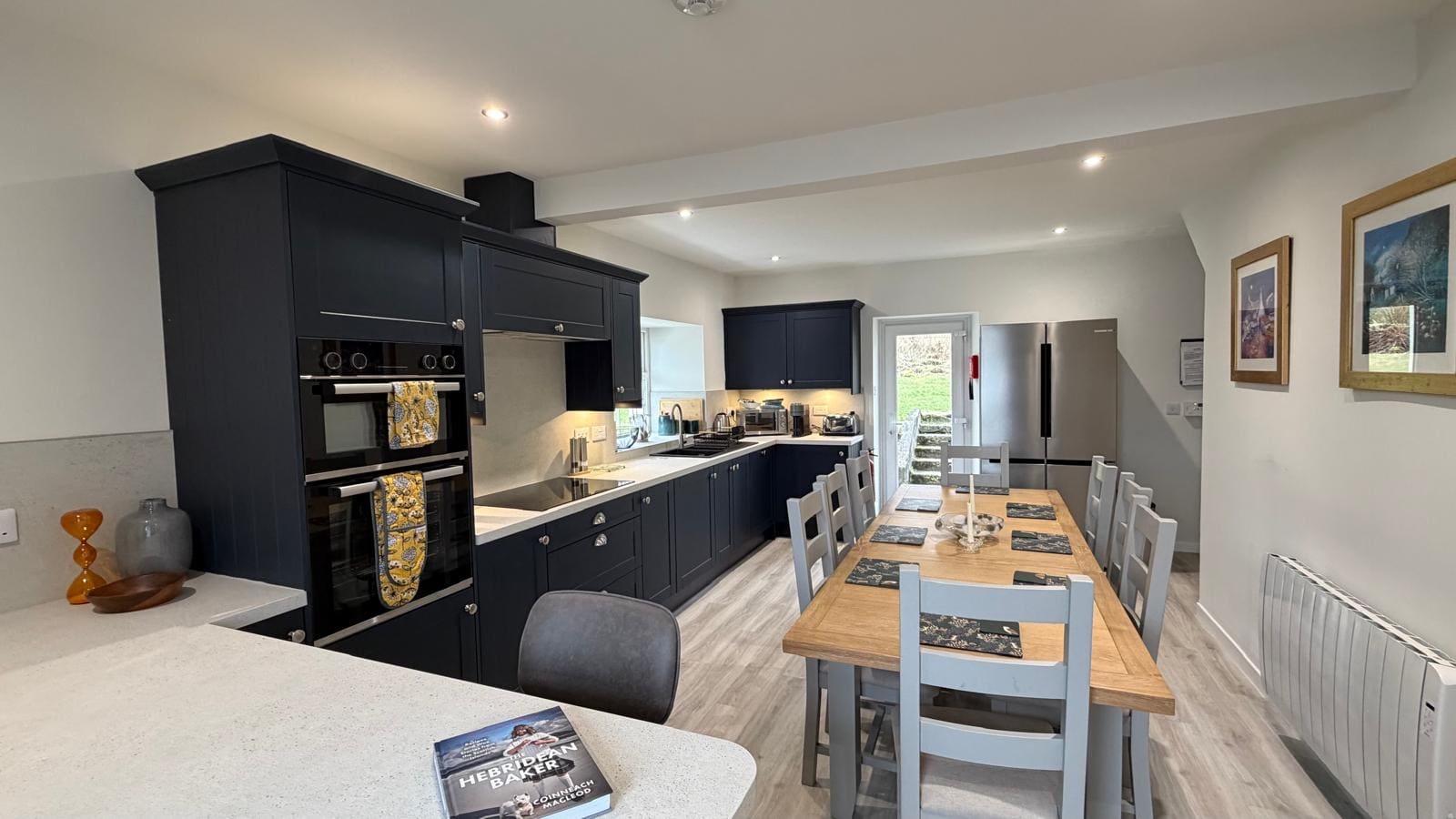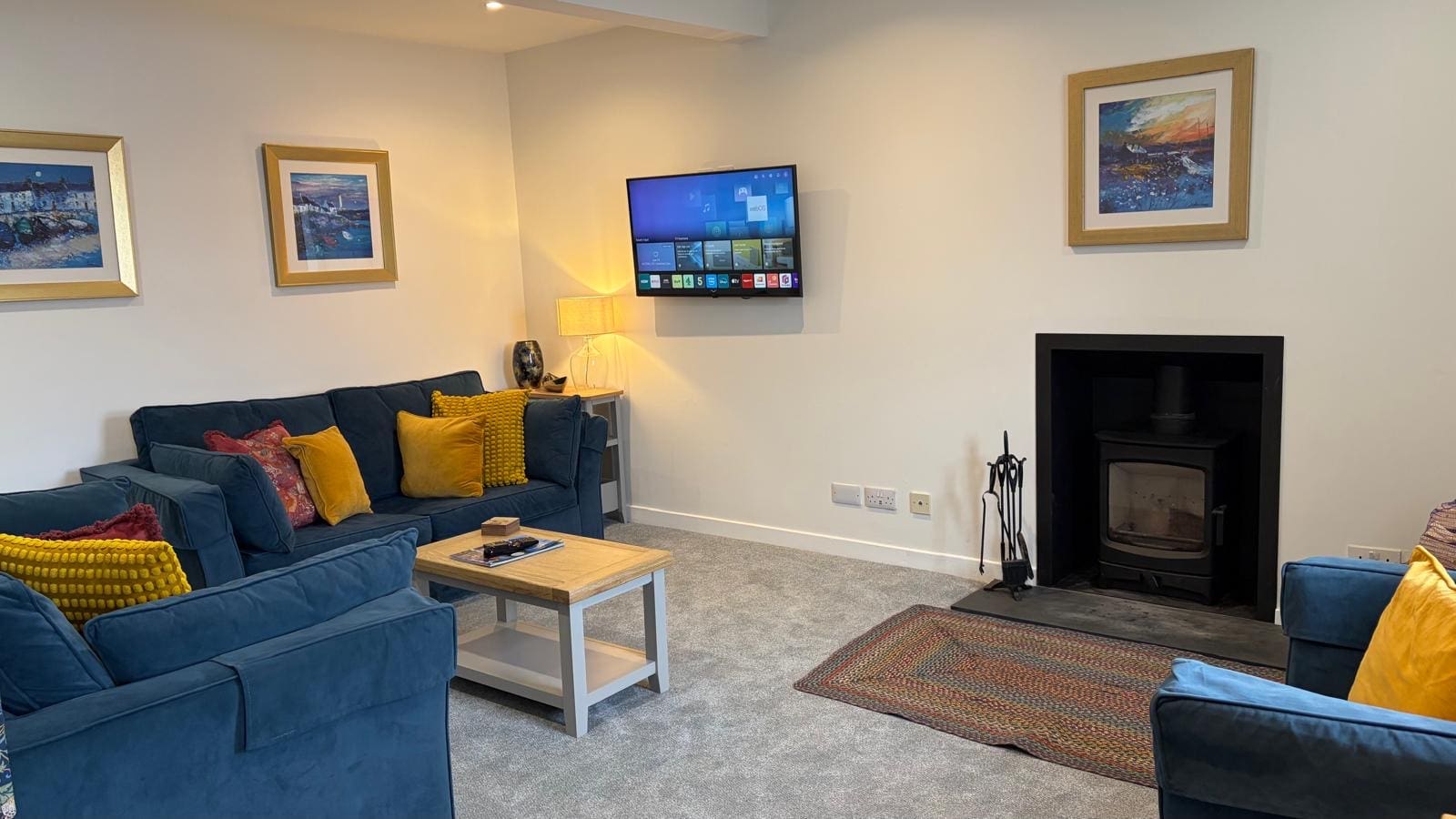 The generous sitting room provides a warm and inviting space to unwind, featuring an open fire, a double sofa bed for occasional guests, and a flat-screen TV with Freeview, DVD player, and iPod dock. The well-equipped kitchen includes an oven, hob, fridge, freezer, microwave, dishwasher, and coffee machine, while the adjoining dining area is perfect for enjoying meals together.