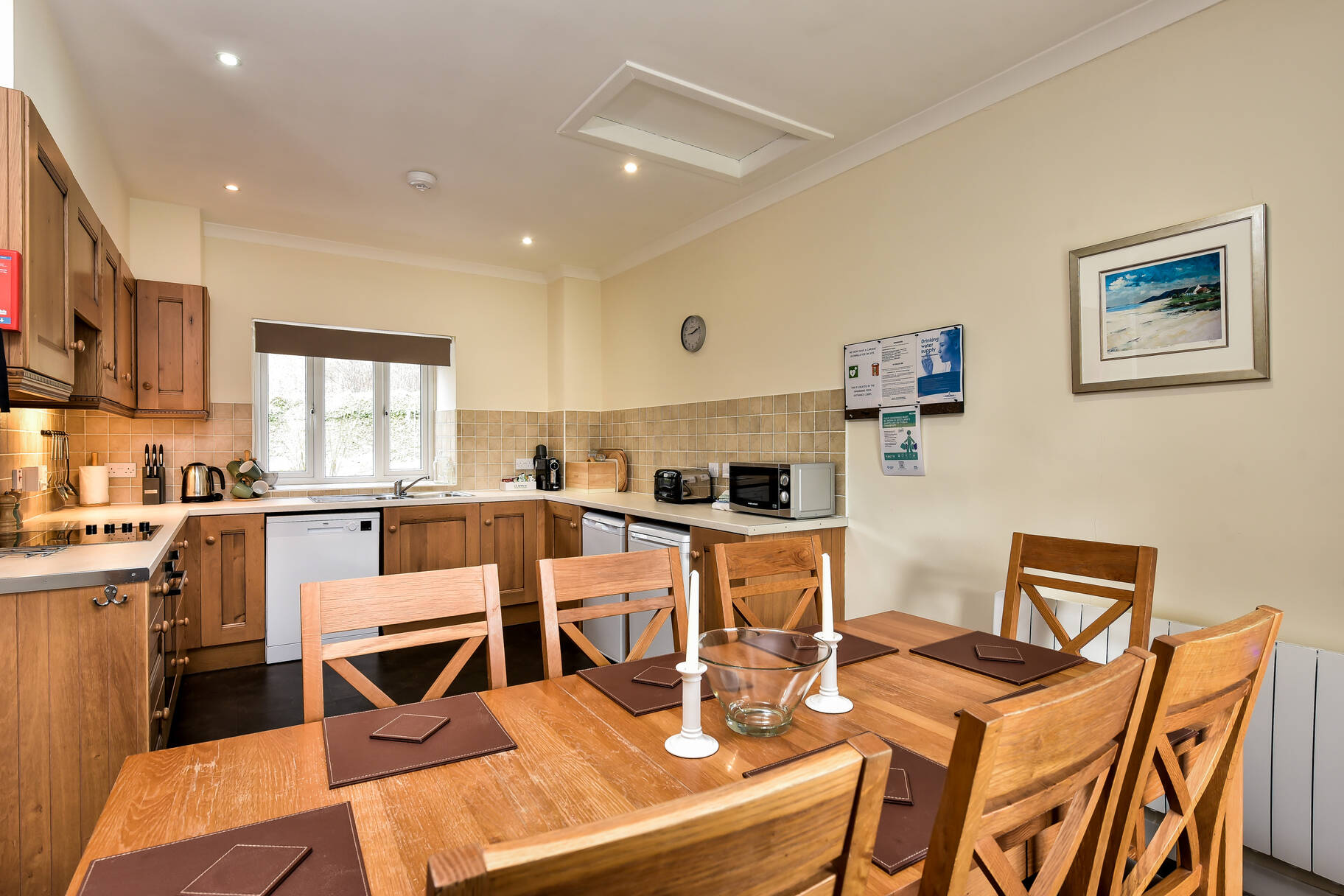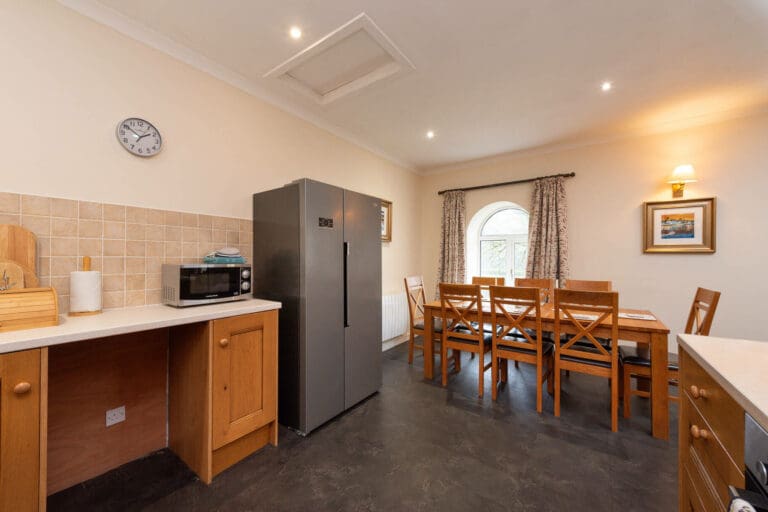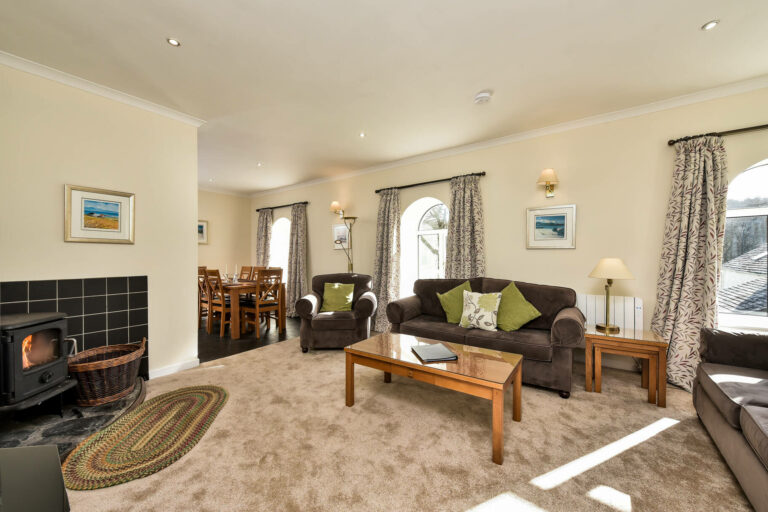 Designed to make the most of its stunning surroundings, the living areas are located on the upper floor, where large arched windows flood the space with natural light and frame the breathtaking views. The cosy sitting room features a wood-burning stove, creating a warm and welcoming atmosphere, while the well-equipped kitchen and dining area provide the perfect setting for shared meals.