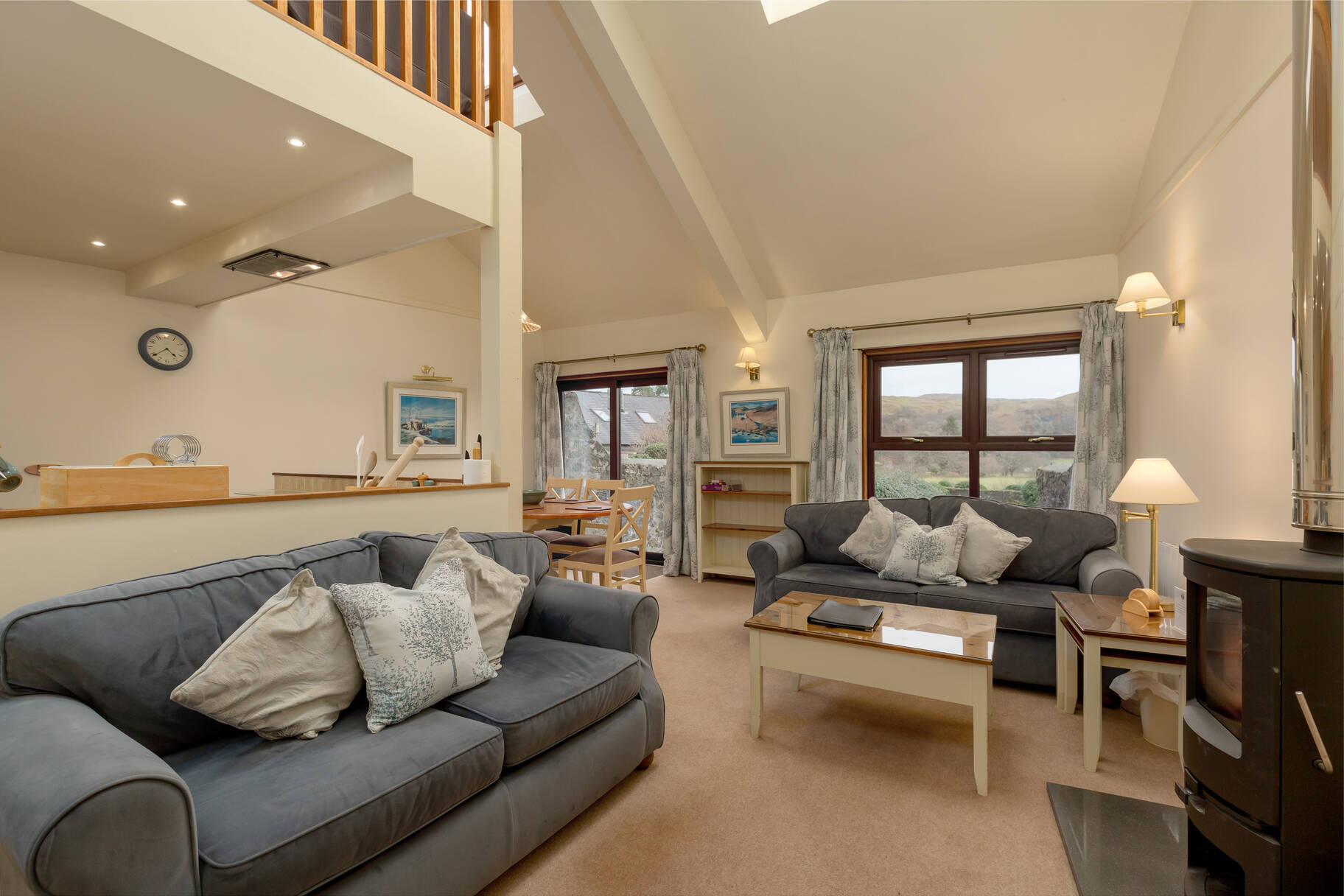 Inside, the spacious living areas are filled with natural light, featuring comfortable seating, a flat-screen TV with Freeview, and a DVD player, offering the perfect space to unwind. The fully equipped kitchens, complete with modern appliances, including a microwave, oven, and dishwasher, ensure that preparing meals is a pleasure. Each cottage offers a restful double bedroom and a cosy twin bedroom, ensuring ample space for all guests.