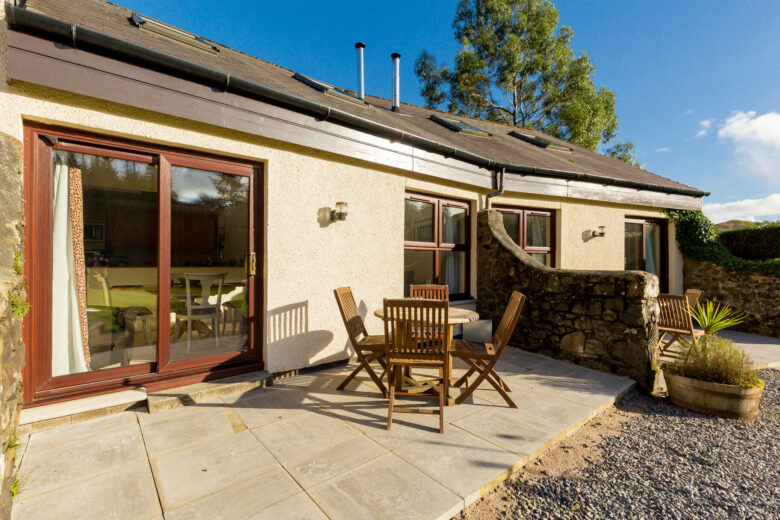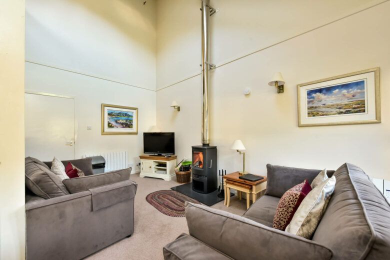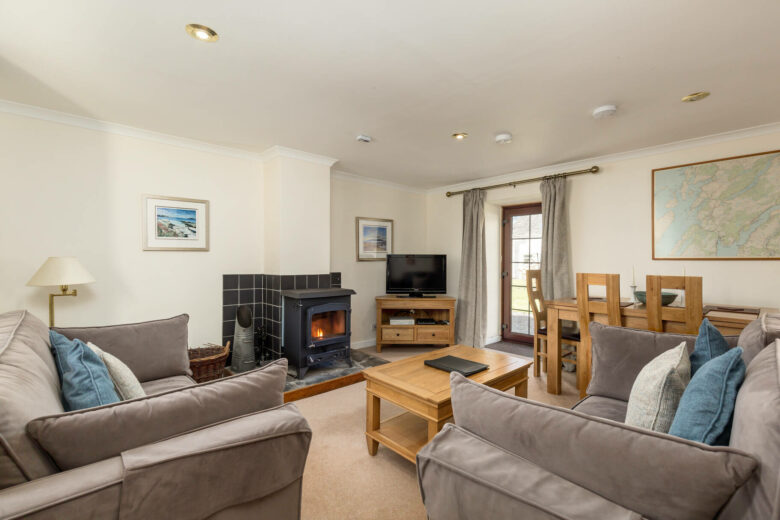 Stables West is a spacious three-bedroom cottage in Melfort Village, featuring an upside-down layout, stunning views, a wood-burning stove, and a shared courtyard garden – perfect for a peaceful retreat.