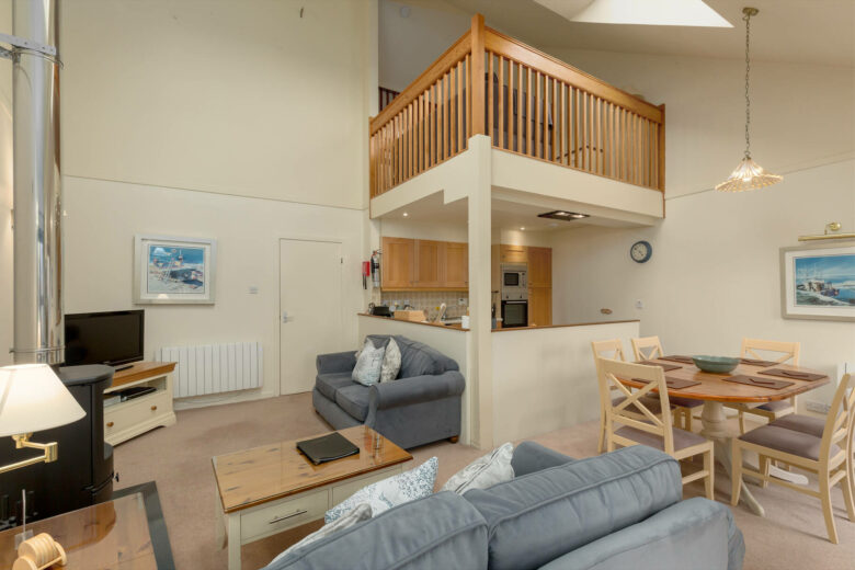 The Loft at Melfort Village offers a spacious two-bedroom apartment with glass balustrade balcony offering stunning views of Loch Melfort and the surrounding countryside, perfect for a relaxing retreat in a scenic setting.